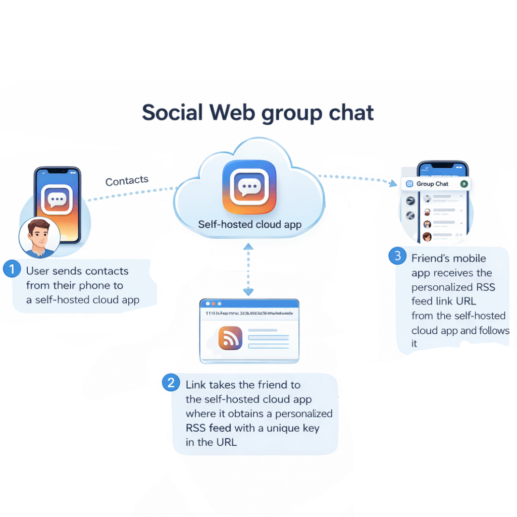 Social Web is a two-part (mobile & server) feed reader app, with group chats that are powered by two-way RSS feeds. In this model, each user has their own server app and the servers connect to each other using RSS and a new RSS extension.