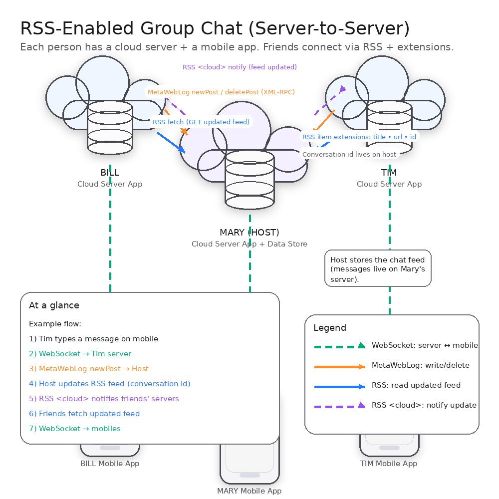 When new messages are added to a group chat, the feeds that come out of that hosts’ server app are updated with the fresh messages. The RSS cloud mechanism in turn sends a notification to all subscribed friends’ servers, prompting each server to fetch and read the updated feed with new messages in it from the host server.